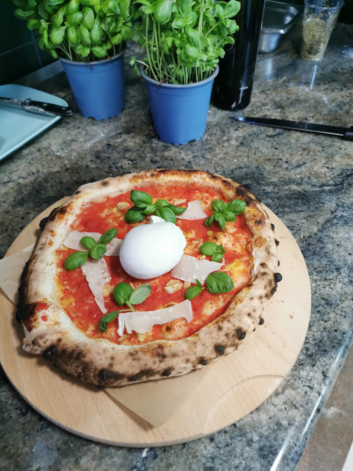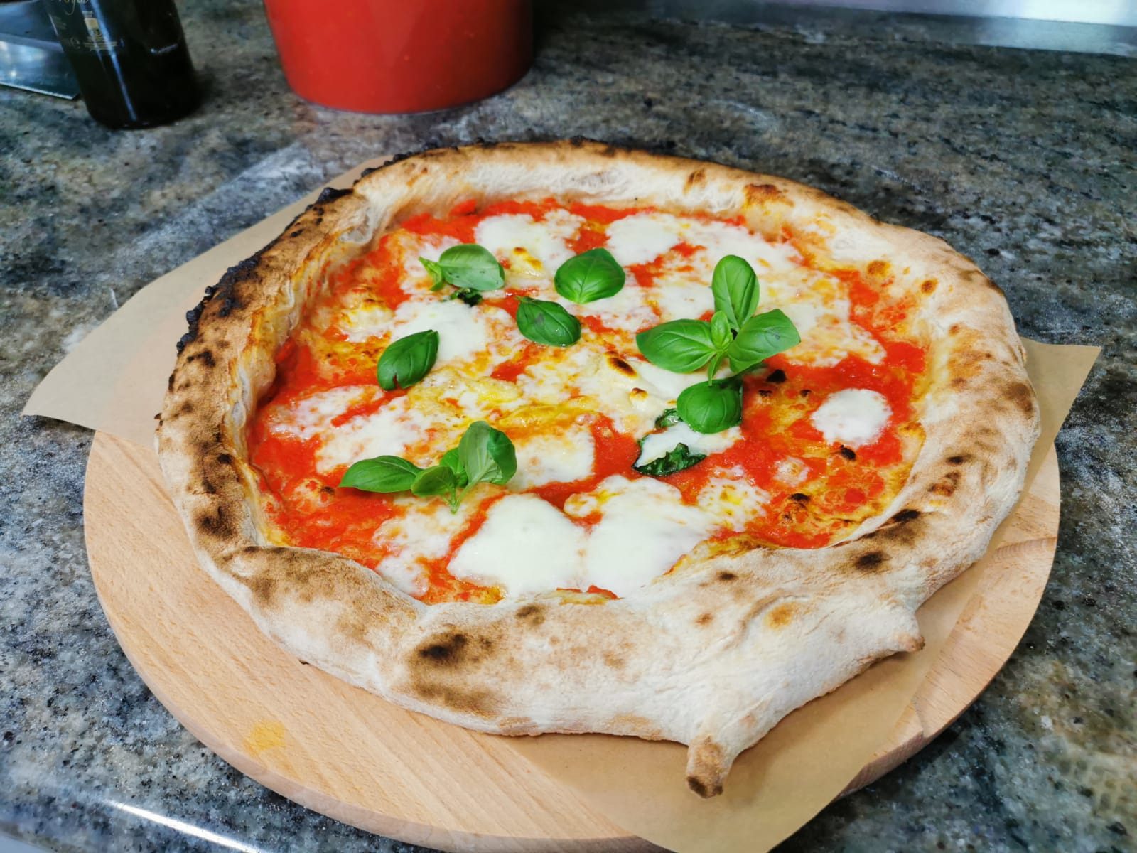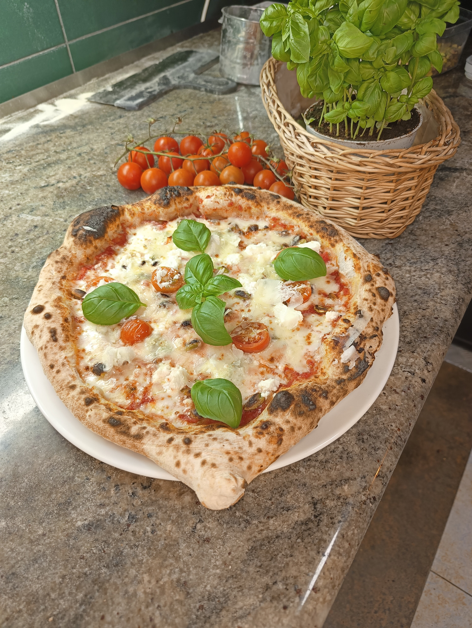 Klasyczna Margherita z serem z płd. Włoch - Mozzarella di Bufala - wytwarzaną z mleka bawolic. oliwa Extra Virgin E.V.O., ser Grana Padano, pomidory Parma, Mozzarella di Bufala, świeża bazylia -