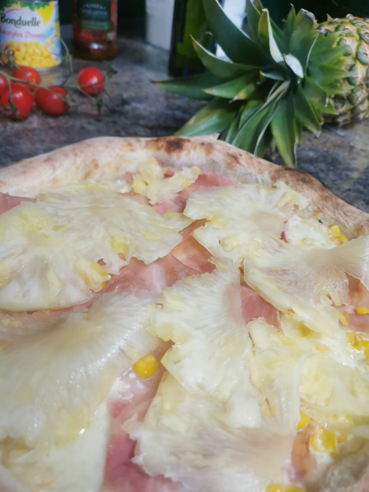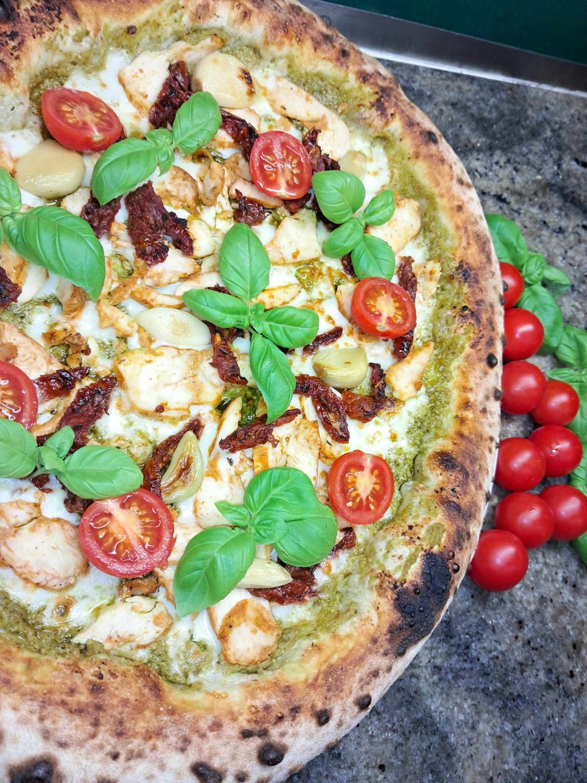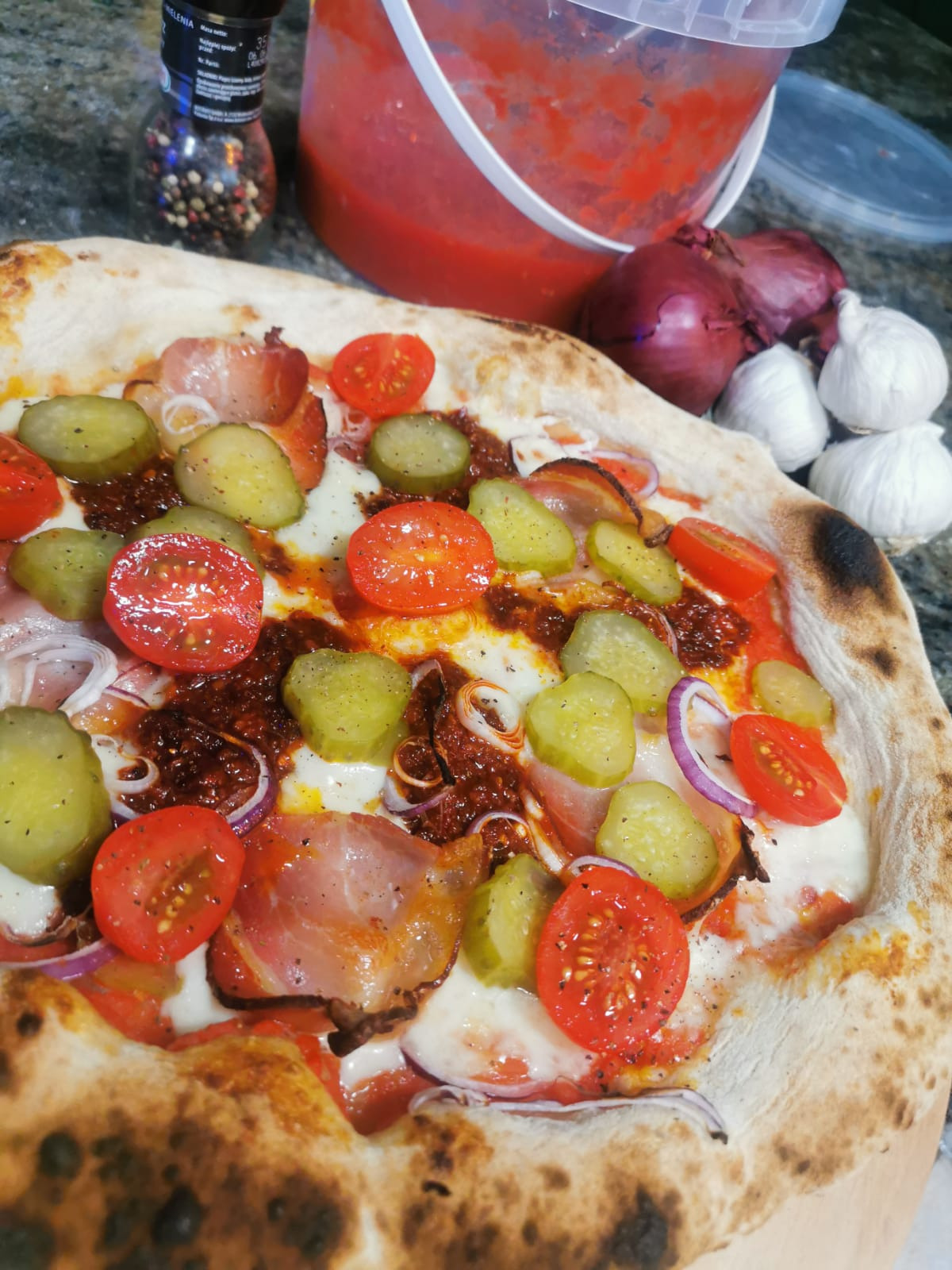 Pizza z dodatkiem polskich smaków - szynki, oscypka i konfitury z żurawiny Creme Fraiche, Mozzarella Fior di Latte, 3 rodzaje swojskich wędlin tradycyjnie wędzonyh (baleron, szynka, polędwica), oscypek, żurawina, por -