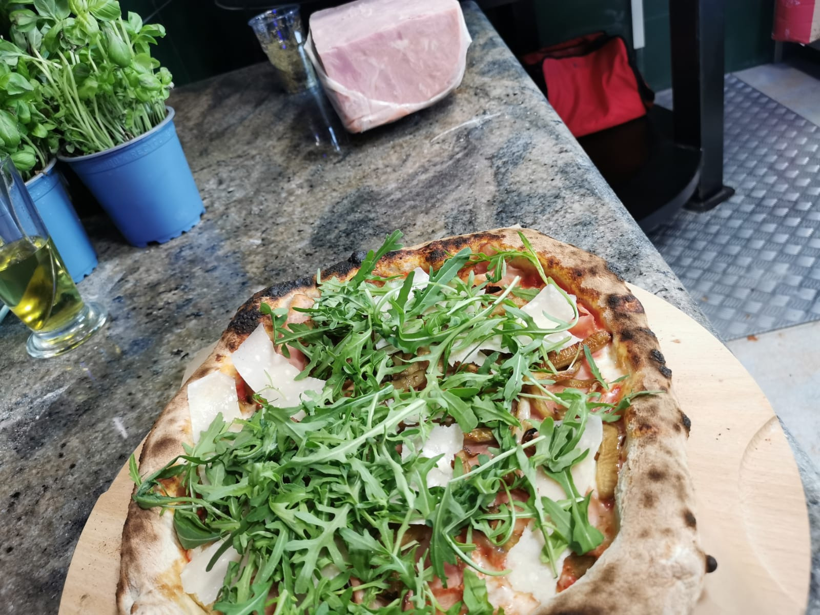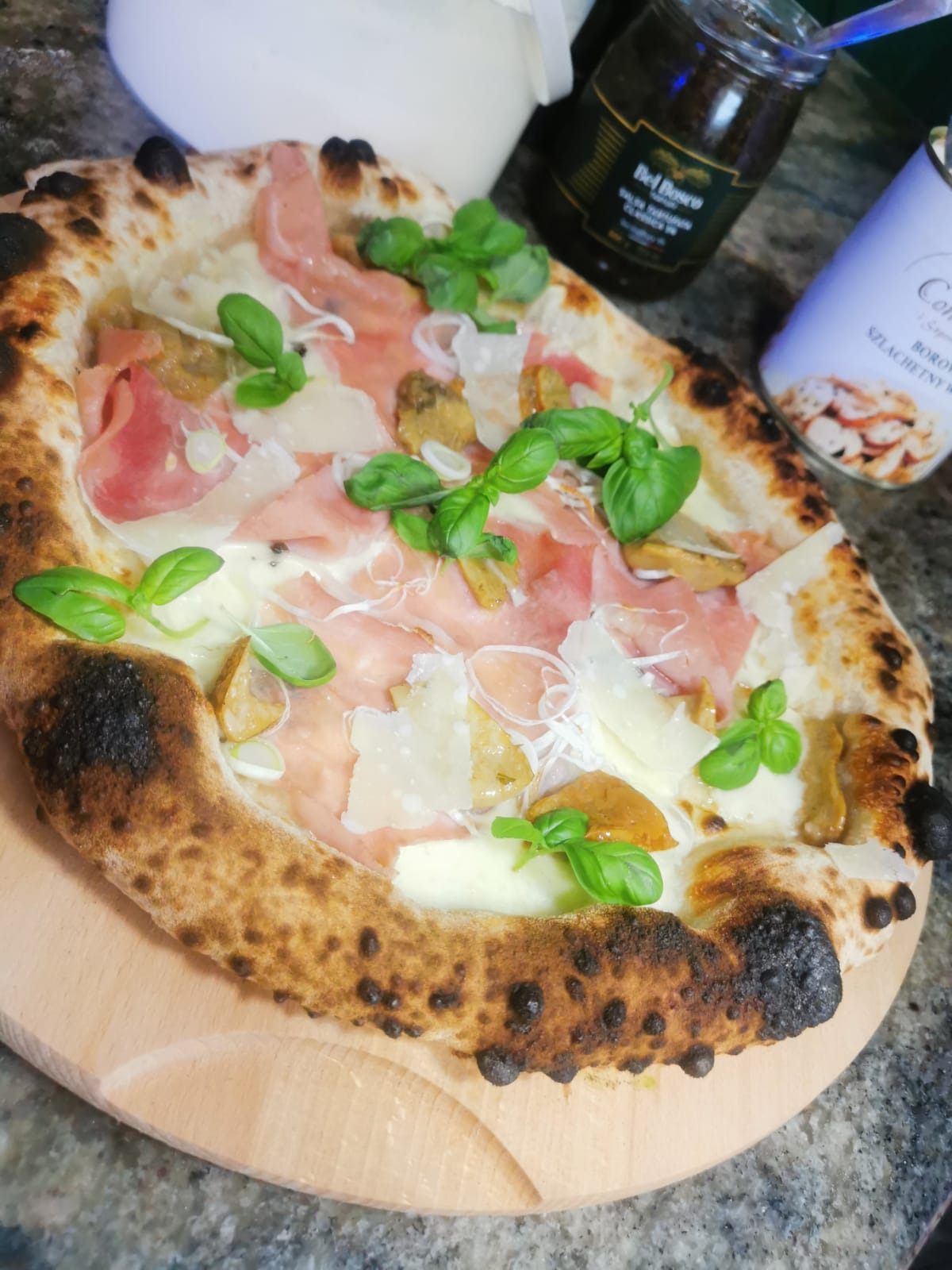 Creme Fraiche, purre dyniowe, ser scamorza, kurki, figa, ser Grana Padano, szynka Prosciutto Crudo -